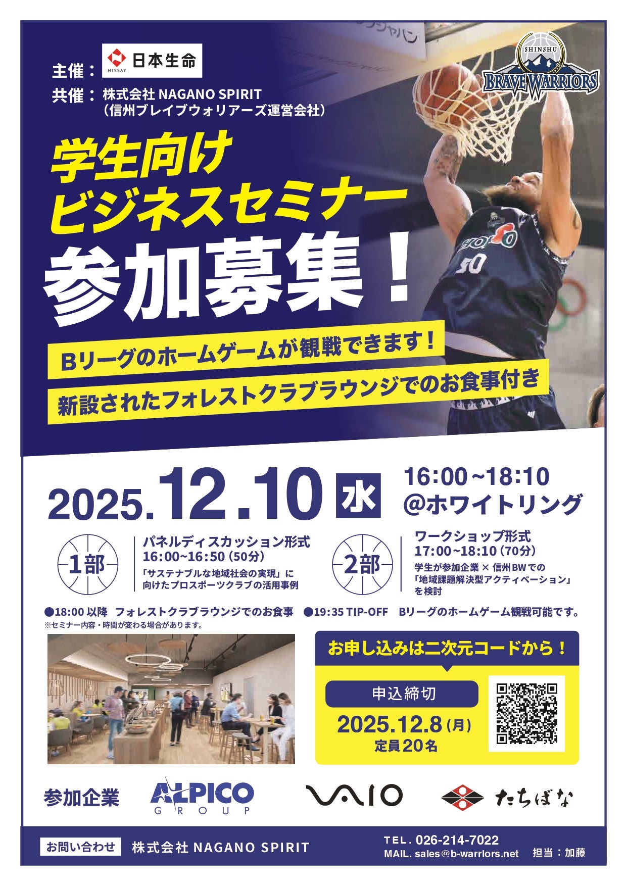 このたび、信州ブレイブウォリアーズでは、12月10日(水)にホワイトリングにて開催される福井ブローウィンズ戦にて、B.LEAGUEサステナビリティパートナーである日本生命保険相互会社 主催の学生向けビジネスセミナーを開催いたします。