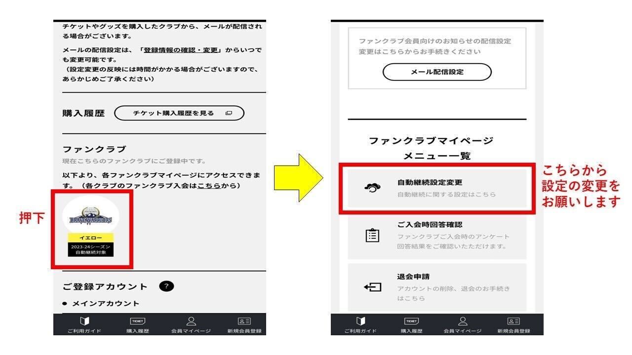 2023年6月30日までにB.LEAGUEチケットの会員マイページで設定を「自動継続をしない」に変更いただき、ご自身のタイミングでWEBにてご希望のコースにご入会ください。