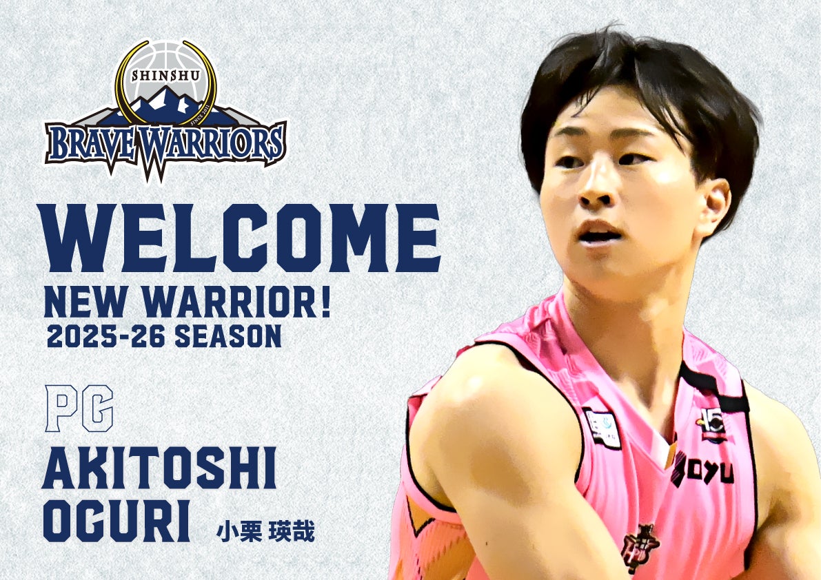 この度、信州ブレイブウォリアーズでは、小栗瑛哉選手と2025-26シーズンにおける選手契約 (新規)が決定しましたことをご報告致します。