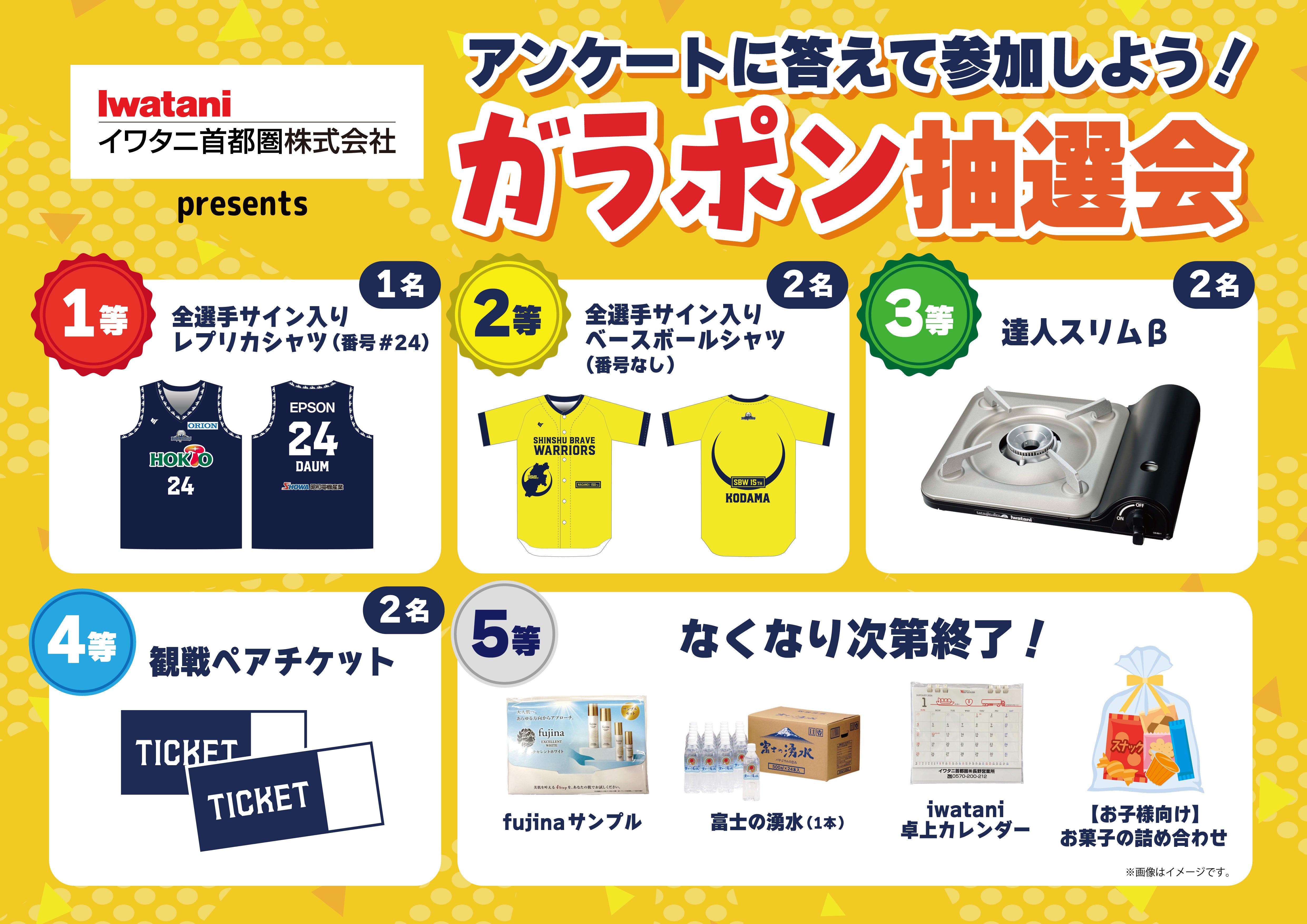 このたび、信州ブレイブウォリアーズでは、11月16日(日)福島ファイヤーボンズ戦のゲームタイトルパートナーであるイワタニ首都圏様のご協力のもと、アンケートに回答すると豪華景品が当たる!抽選会を開催します。