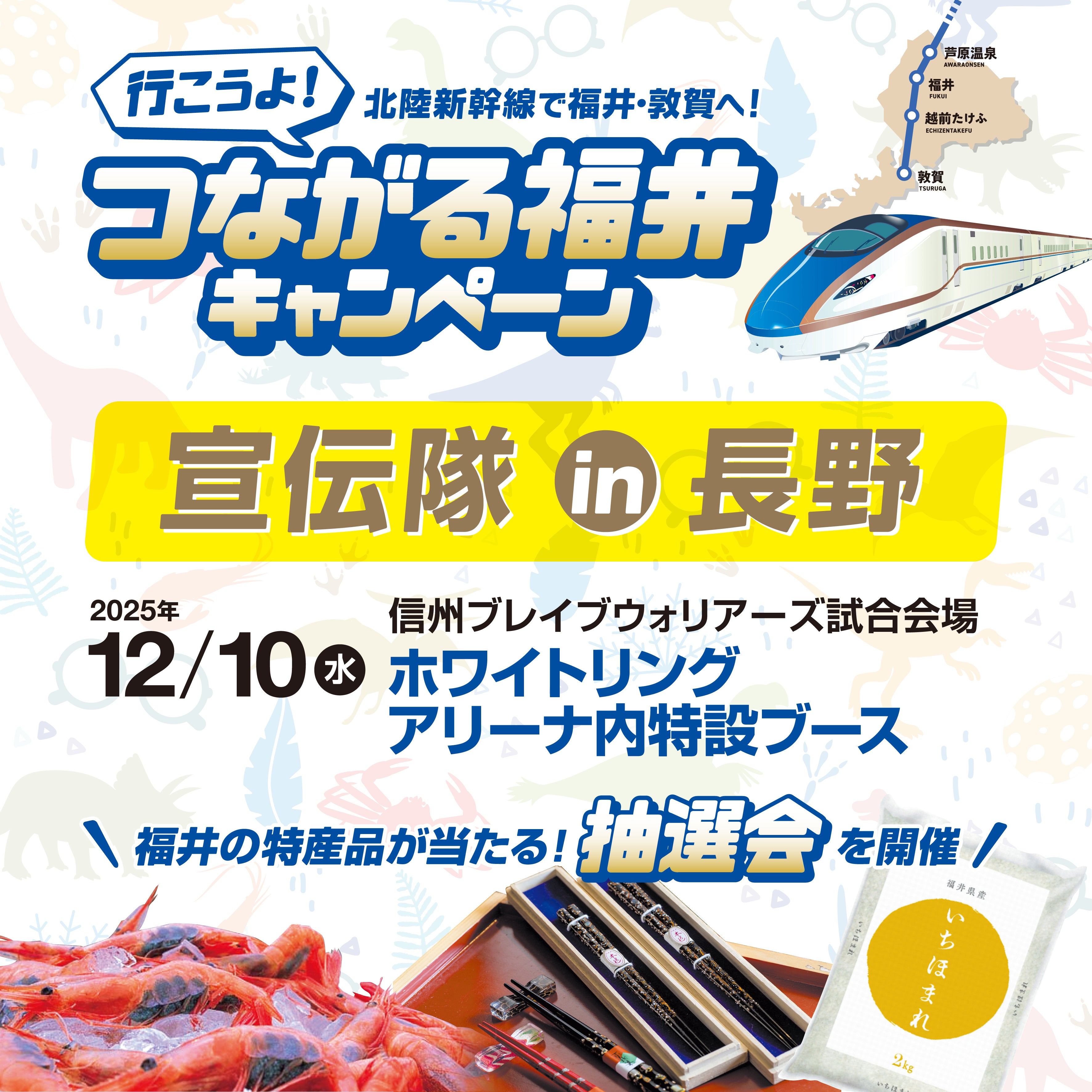 12月10日(水)に開催する福井ブローウィンズ戦において、北陸新幹線の福井・敦賀開業で身近になった長野県のブースターの皆さまに福井県の魅力をPRする「"行こうよ!"つながる福井キャンペーンブース」が出展!
