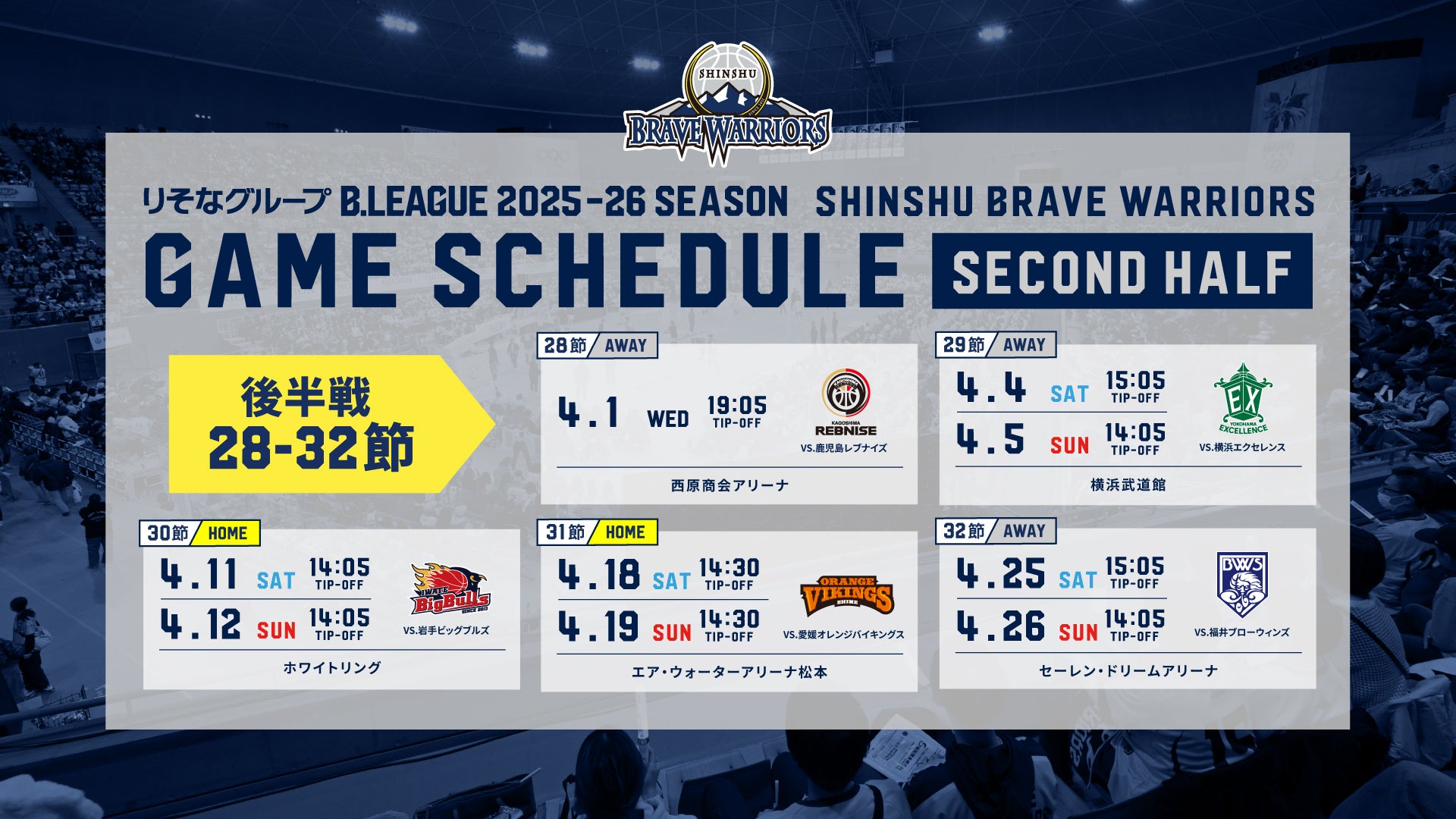 このたび、2025-26シーズン りそなグループ B2リーグ後半戦(第28節~第32節)の試合開始時間が決定しましたのでお知らせいたします。