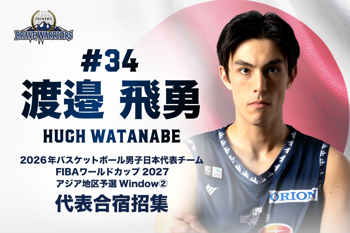このたび、信州ブレイブウォリアーズより、#34 渡邉飛勇選手が2月17日(火)から行われる2026年バスケットボール男子日本代表 FIBAワールドカップ2027アジア地区予選Window2直前合宿メンバーに招集されましたのでお知らせします。
