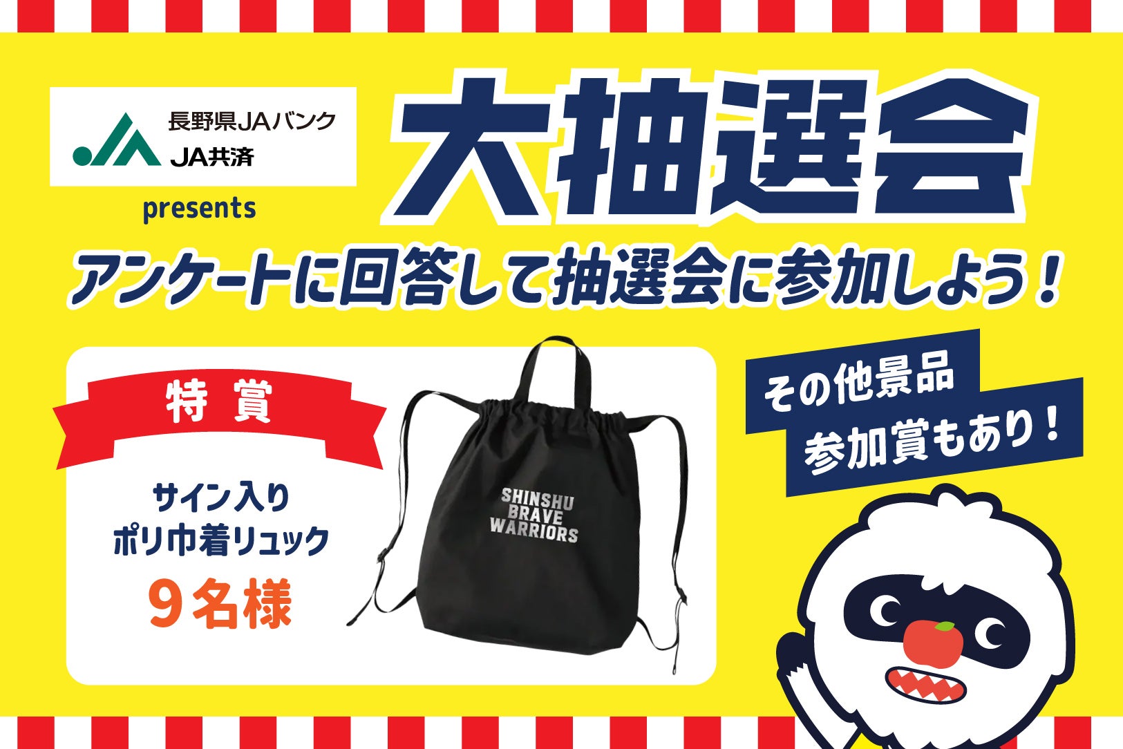 このたび信州ブレイブウォリアーズでは、2月15日(日)にことぶきアリーナ千曲で開催する山形ワイヴァンズ戦にて、ゲームタイトルパートナーである長野JAバンク・JA共済様のご協力のもと「長野JAバンク・JA共済 presents 大抽選会」を実施することとなりましたのでお知らせいたします。