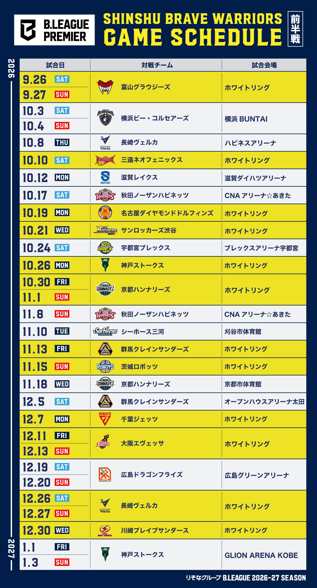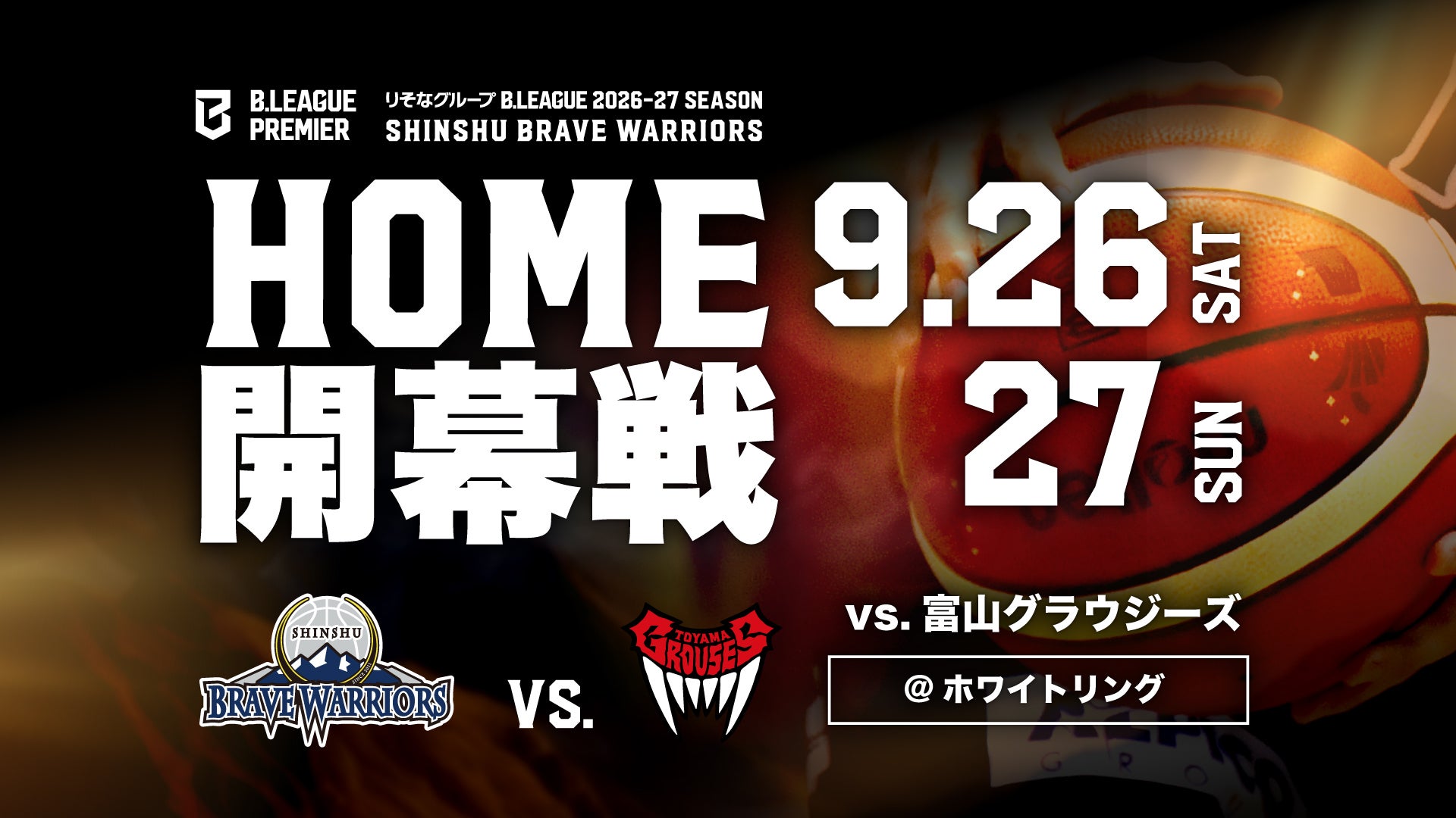 また、信州ブレイブウォリアーズのホーム開幕戦は、2026年9月26日(土)、27日(日) ホワイトリングにて vs.富山グラウジーズとなります。