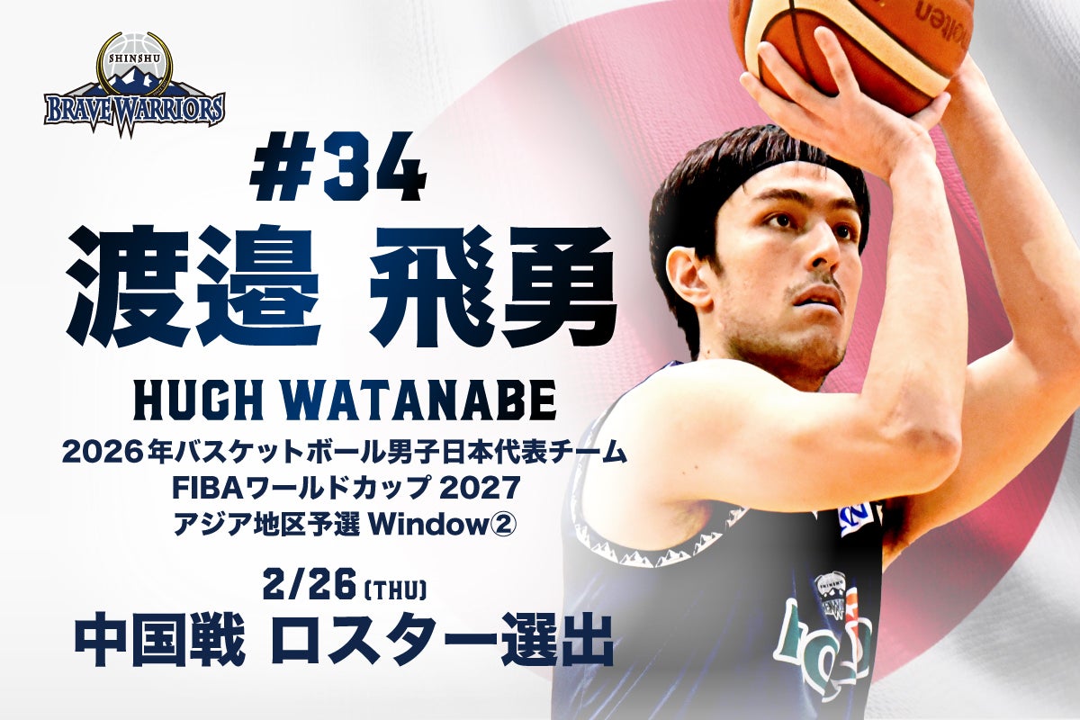 このたび、信州ブレイブウォリアーズより、#34 渡邉飛勇選手が2月26日(木)に行われる2025年度 バスケットボール男子日本代表 FIBAワールドカップ2027アジア地区予選Window2 中国戦のロスターに選出されましたのでお知らせします。