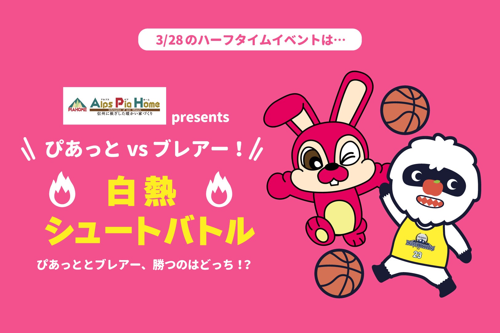 このたび、信州ブレイブウォリアーズでは、3月28日(土)福井ブローウィンズ戦のハーフタイムにて、「アルプスピアホーム presents ぴあっとvsブレアー🔥白熱🔥シュートバトル」を開催いたします。