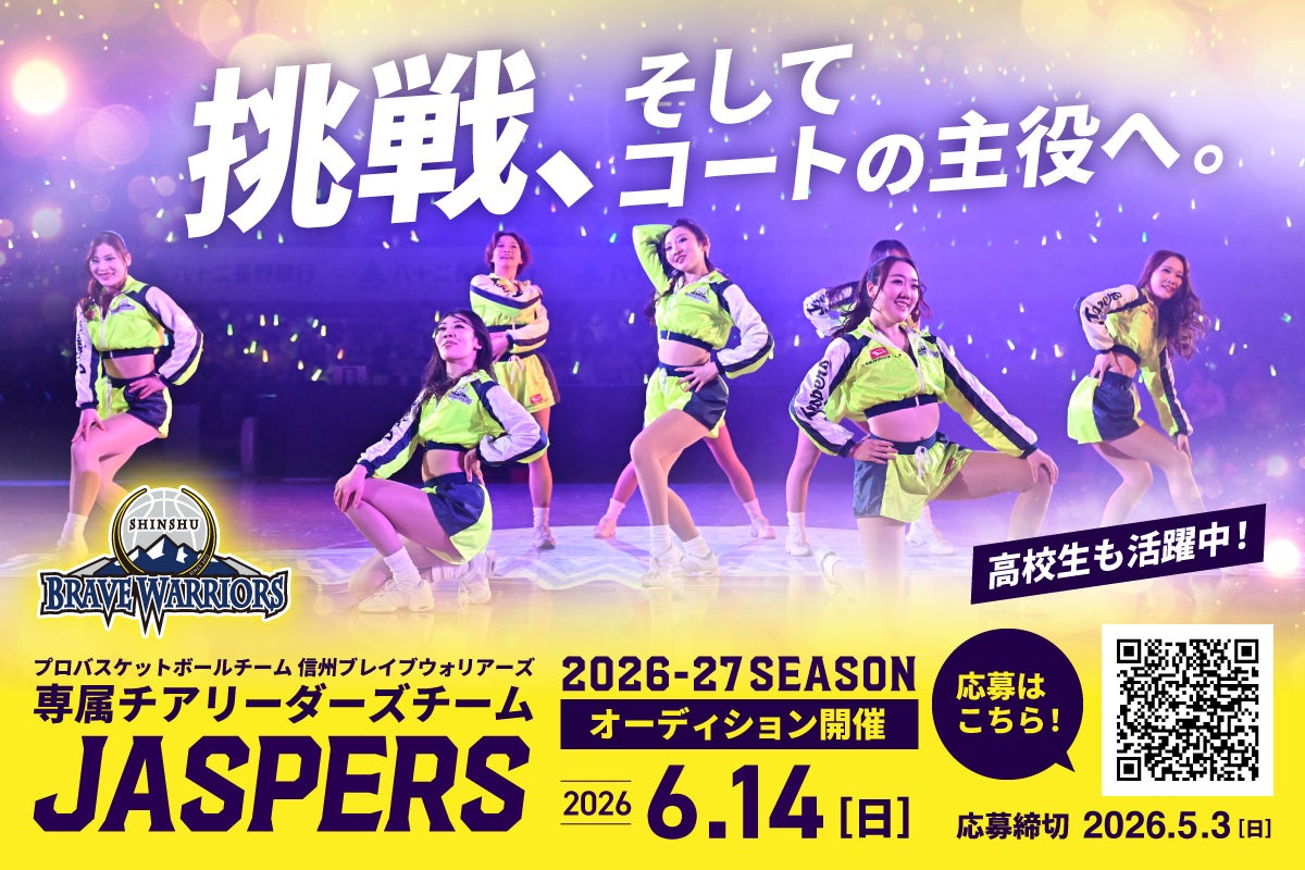 このたび信州ブレイブウォリアーズでは、2026-27シーズンにおける信州ブレイブウォリアーズ チアリーダーズチーム"JASPERS" のオーディションを開催することとなりましたのでお知らせいたします。