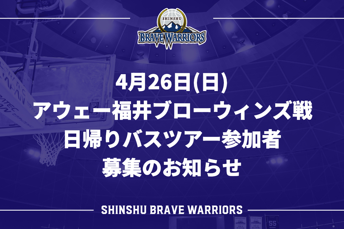 4月26日(日) アウェー福井ブローウィンズ戦日帰りバスツアー参加者募集のお知らせ