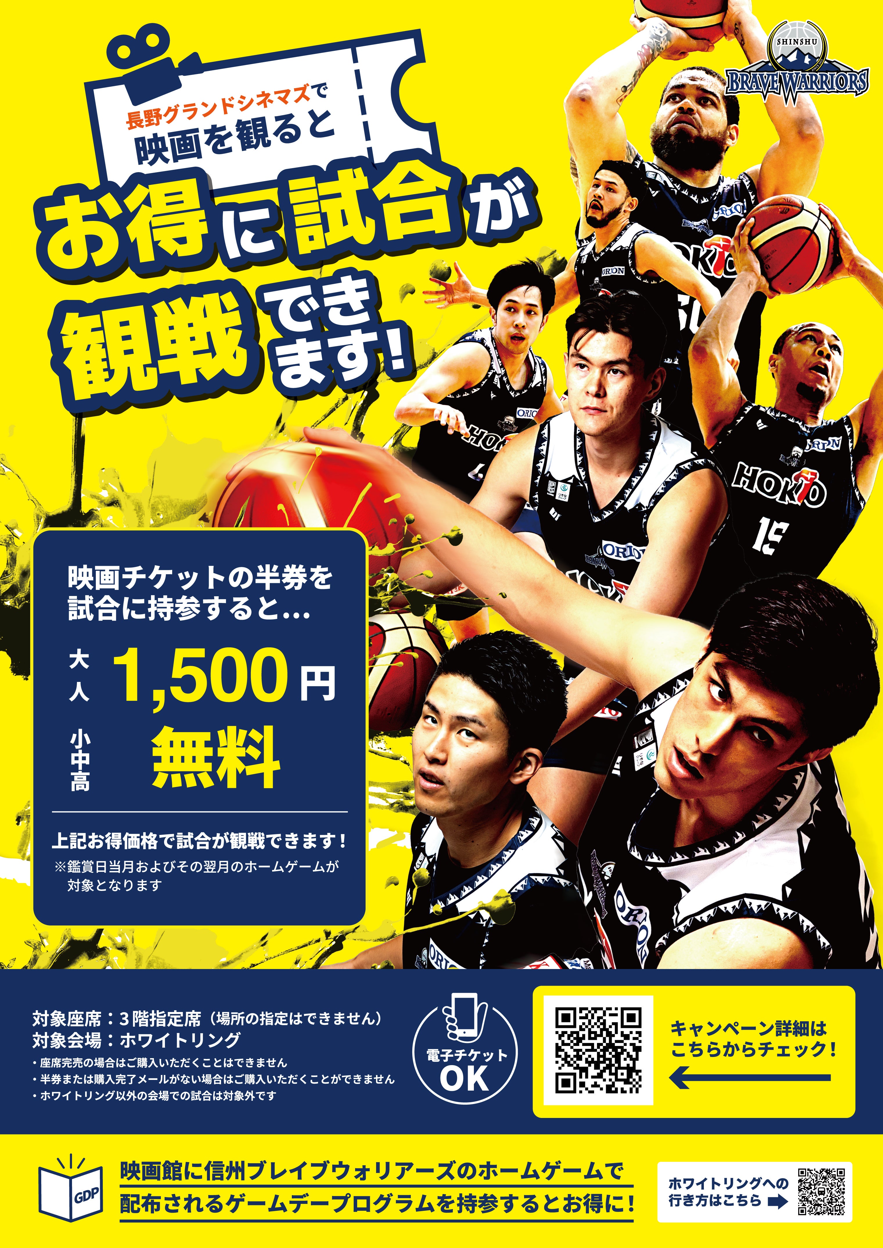 長野グランドシネマズで映画をご覧になり、映画の半券を信州ブレイブウォリアーズのホームゲームにお持ちいただくと、その日の試合の当日券がオトクにお買い求めいただけます。